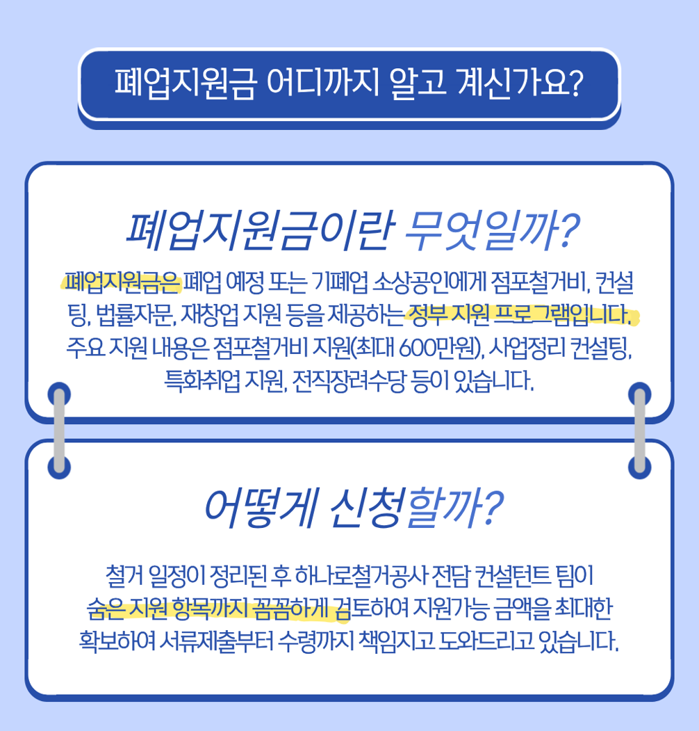 천안 성환 철거 상담을 진행하다 보면 많은 사업자들이 희망리턴패키지 철거지원 제도에 대해 문의하는 경우가 많다. 해당 제도는 폐업을 준비하는 소상공인을 대상으로 철거 비용 일부를 지원하는 제도다. 지원 기준에 따라 평당 약 20만원 수준으로 철거 비용 지원이 가능하며 최대 600만원까지 지원을 받을 수 있다. 매장을 정리하는 과정에서 철거 비용 부담이 발생할 수 있기 때문에 이러한 지원 제도를 함께 확인하는 경우도 많다. 하나로철거에서는 희망리턴패키지 무료 컨설팅을 통해 철거지원금 신청 방법을 안내하고 있다.